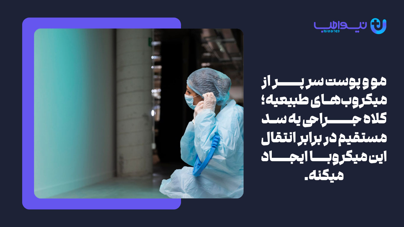 مو و پوست سر بهطور طبیعی حاوی میکروارگانیسمهایی مانند استافیلوکوکها هستند. این عوامل میتوانند با ریزش مو یا پوستههای کوچک پوست وارد فضای جراحی شوند. استفاده از کلاه جراحی یک سد مؤثر در برابر این مسیر انتقال ایجاد میکند و خطر آلودگی مستقیم ناحیه عمل را بهطور قابل توجهی کم میسازد.